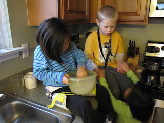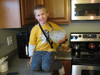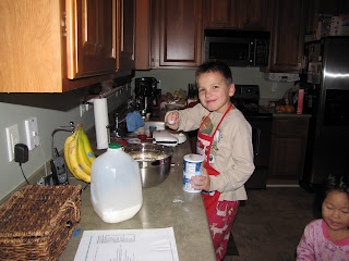 Jacob has taken a real interest lately, mostly since we came home from SVG in Aug, in wanting to cook and run a restaurant. He likes to set the table and take food orders. This morning Bob was home to take Leah to preschool, so we had time to make waffles for Waffle Wednesday. Jacob did everything himself. We even doubled the recipe so he had practice with math - but don't him he did math! He did a great job.